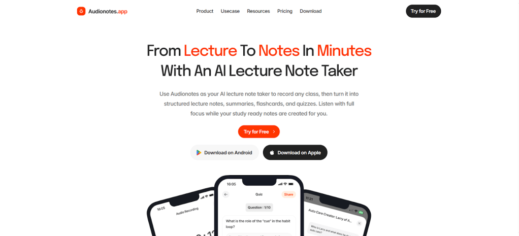 Audionotes is a powerful AI lecture note taker built for both teachers and students. You can record a lecture or upload a video or audio file, and it turns it into clean notes, summaries, quizzes, and flashcards. It’s cross-platform, so notes stay synced across devices.