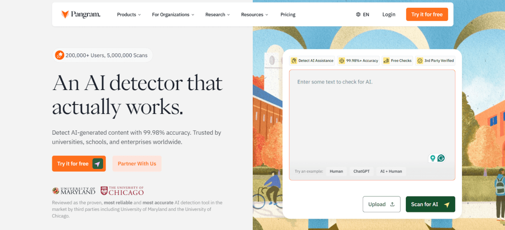 Pangram is a plagiarism and AI-detection tool made for schools. It checks if a student’s work was written or edited using AI tools, or if it’s plagiarised. Teachers can upload files or use it within platforms like Google Classroom. The reports are detailed, and it supports over 20 languages. It helps teachers keep things fair and transparent without extra effort.